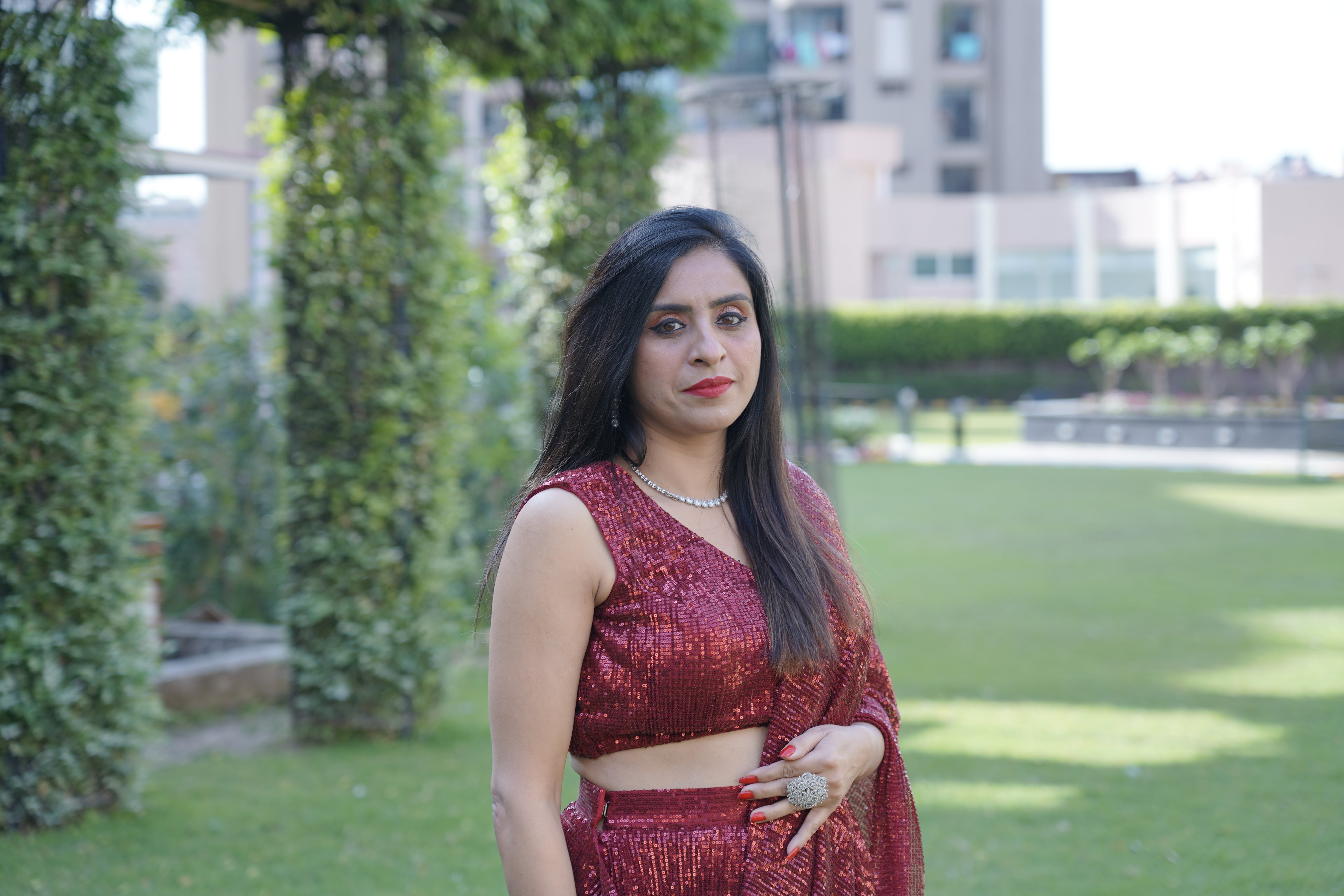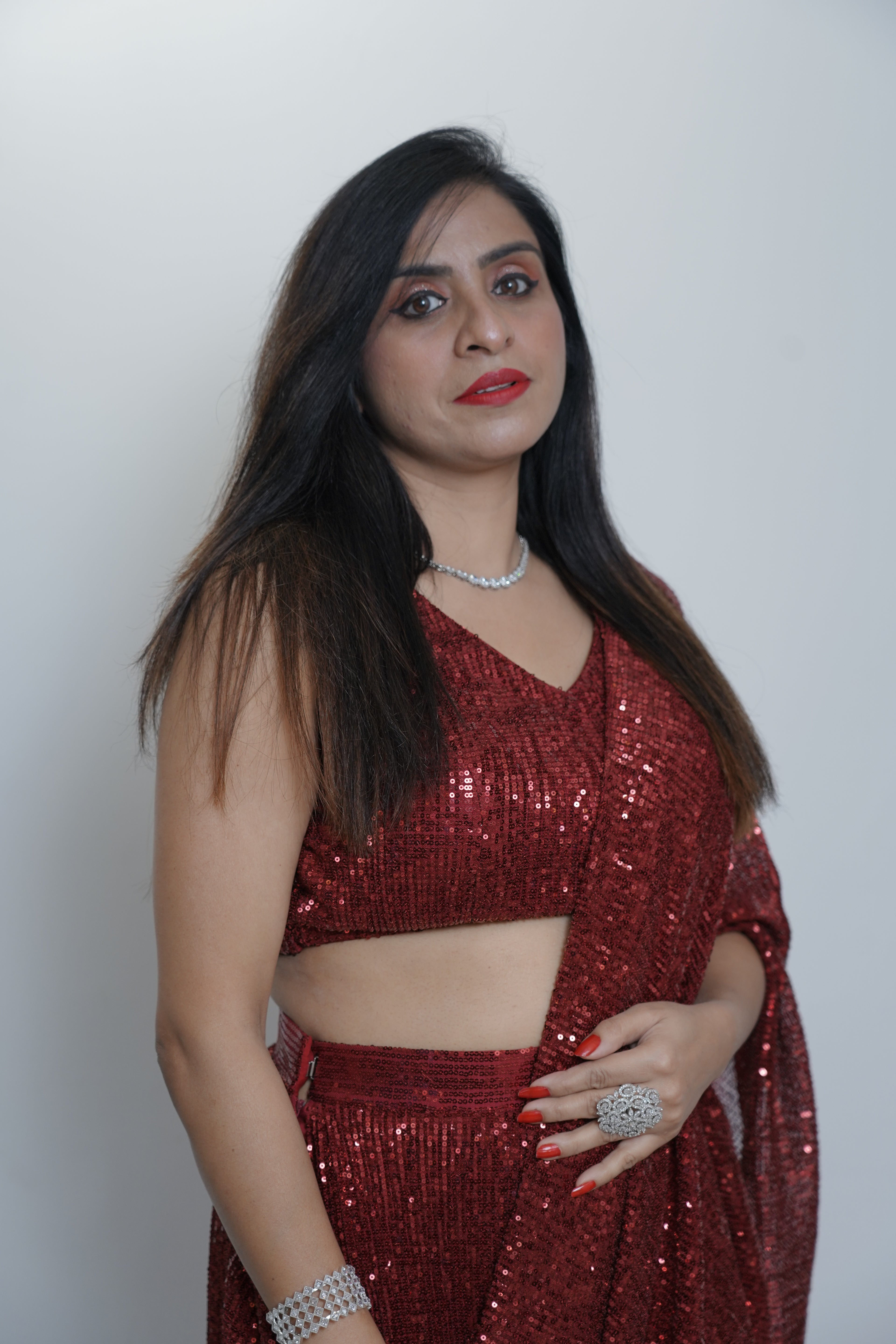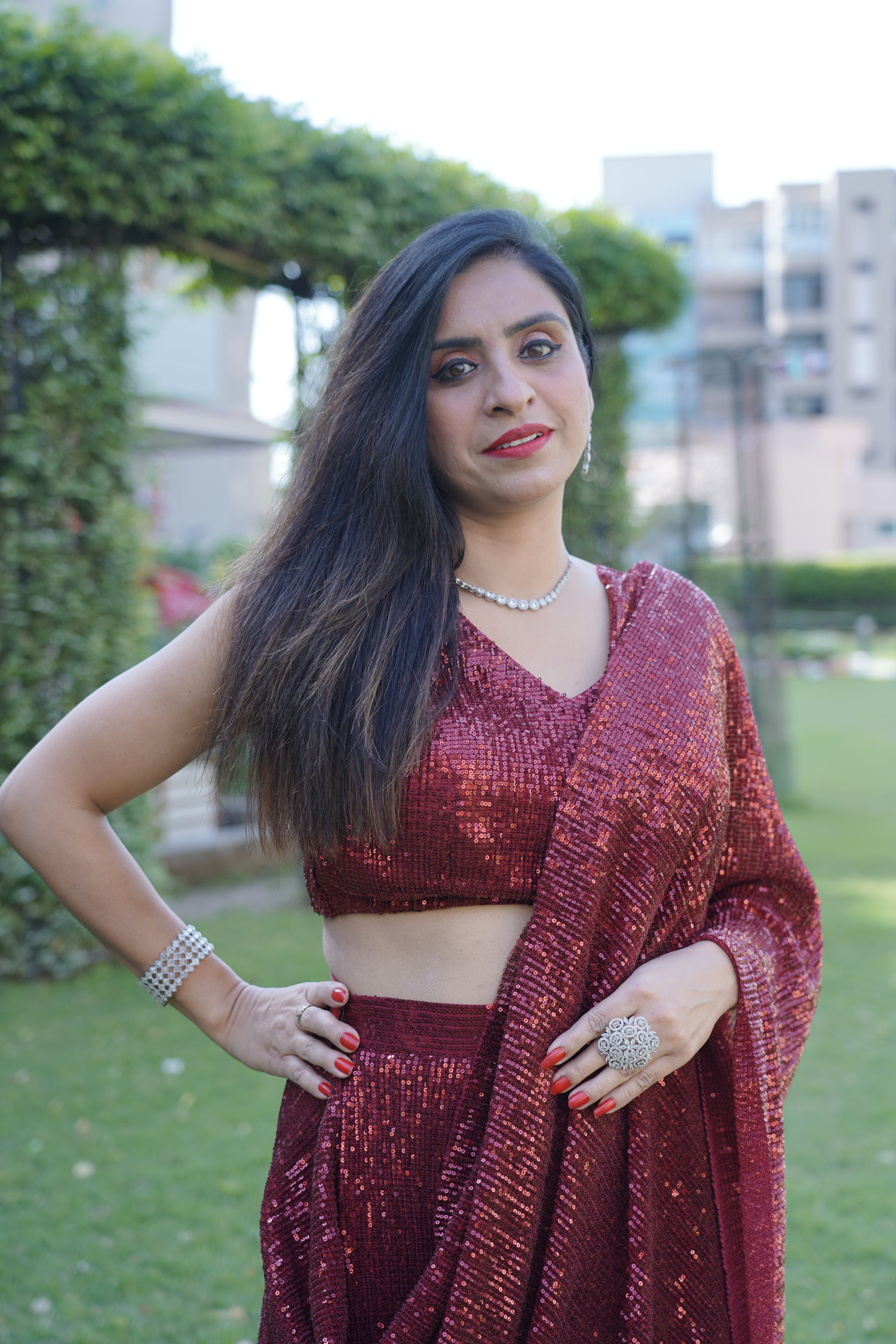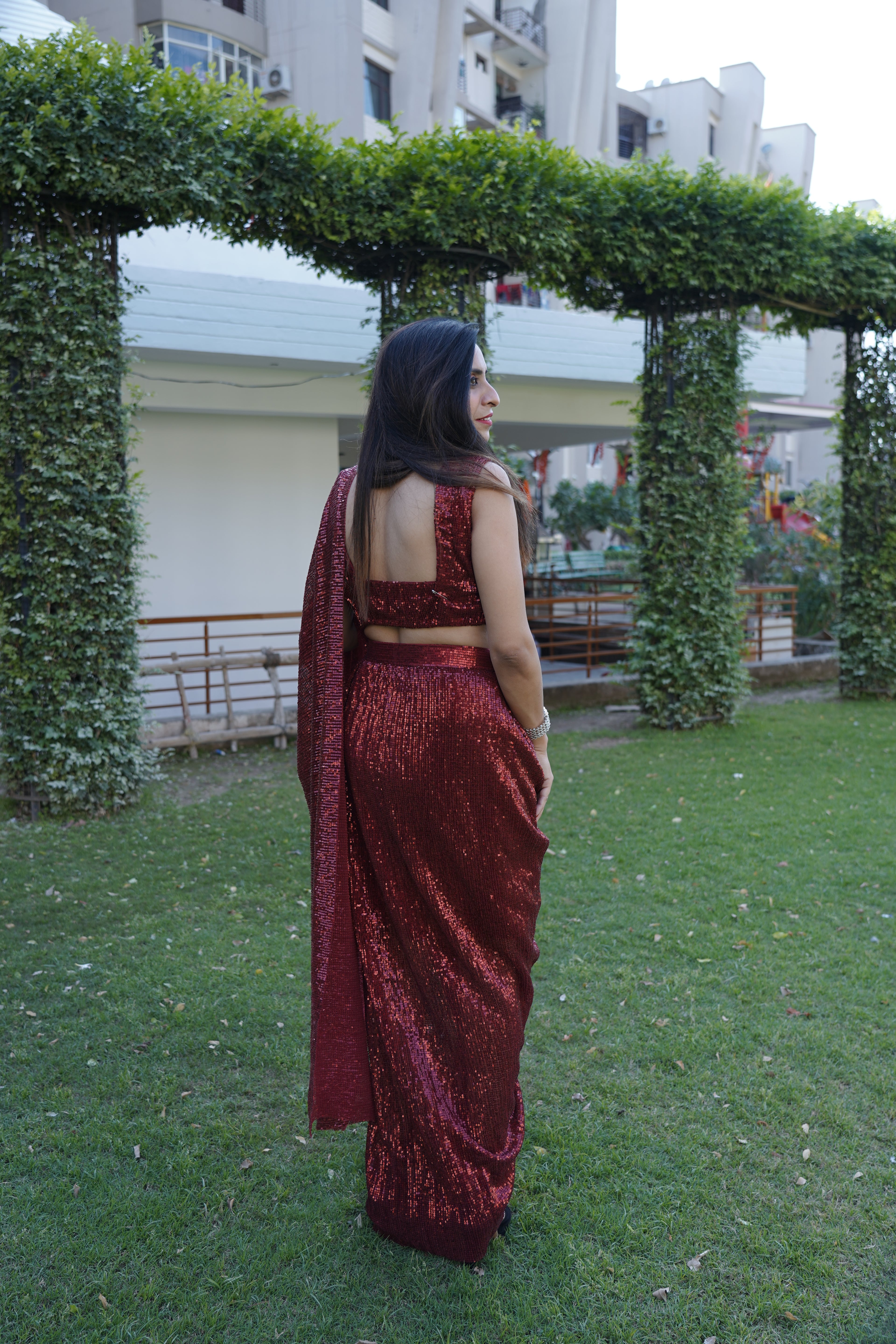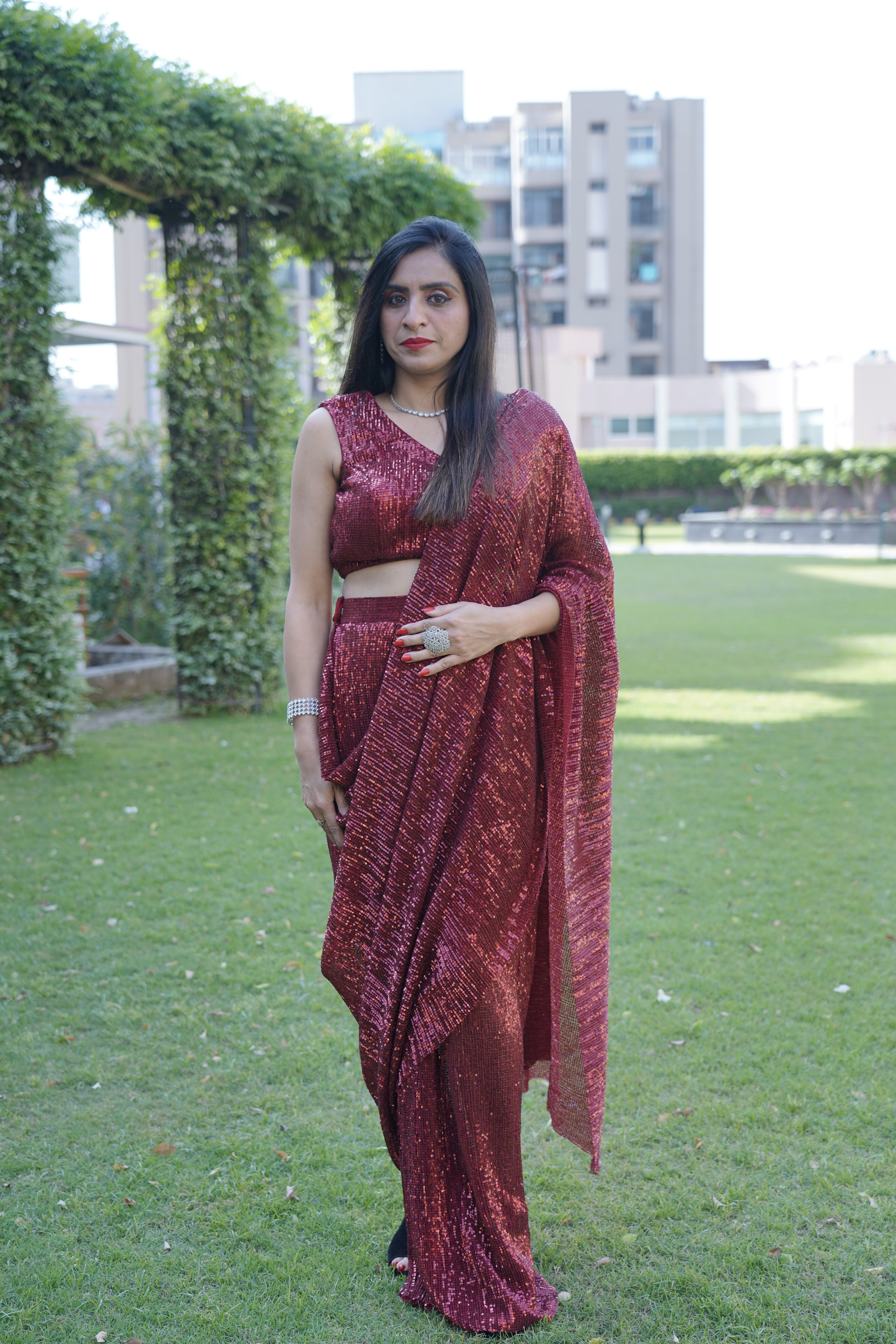 The functional Saree comes pre-pleated and pre-stitched and ready to wear. It is made of heavily sequined fabric. The saree has a pre-stitched petticoat inside. It doesn’t come with a blouse.