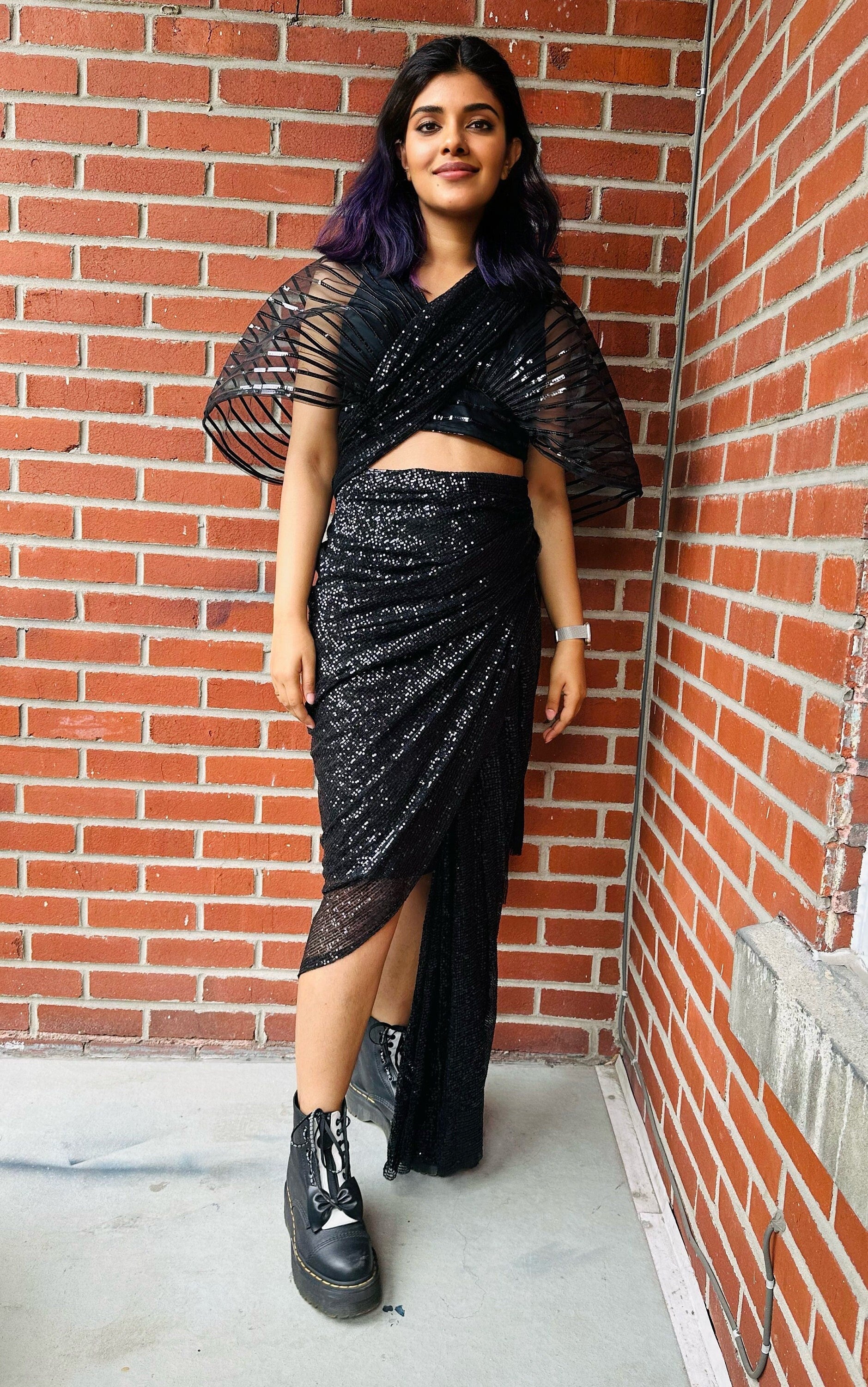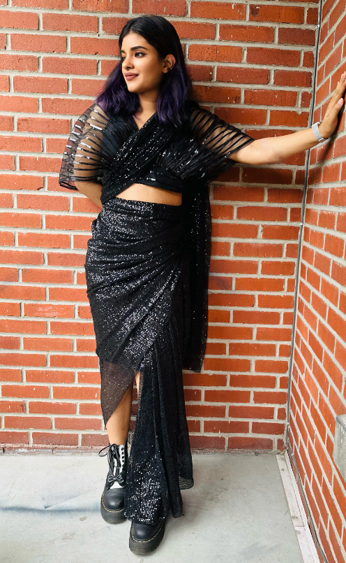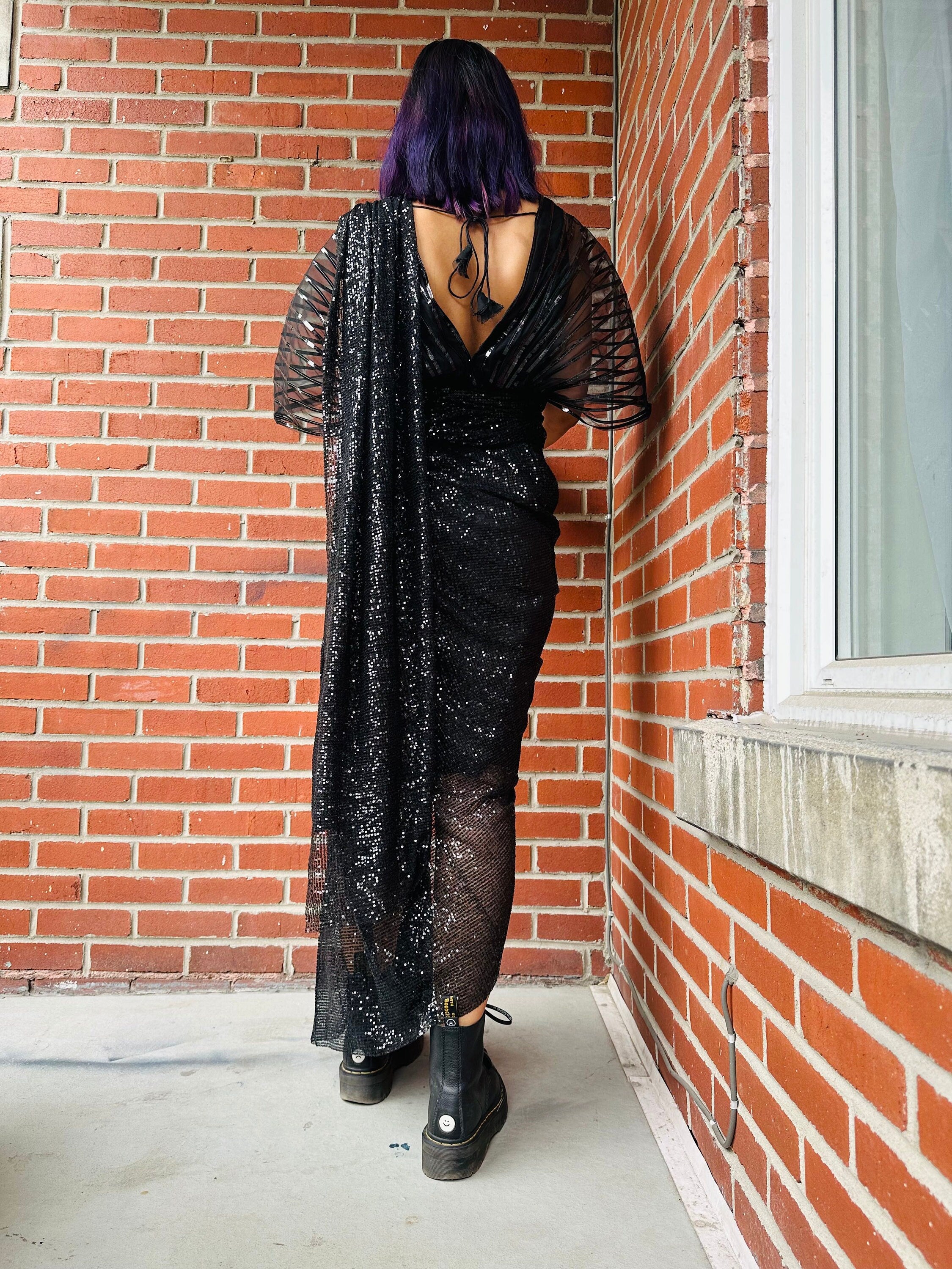 The functional Saree comes pre-pleated and pre-stitched and ready to wear. It is made of heavily sequined fabric. The saree has a pre-stitched petticoat inside. It doesn’t come with a blouse.