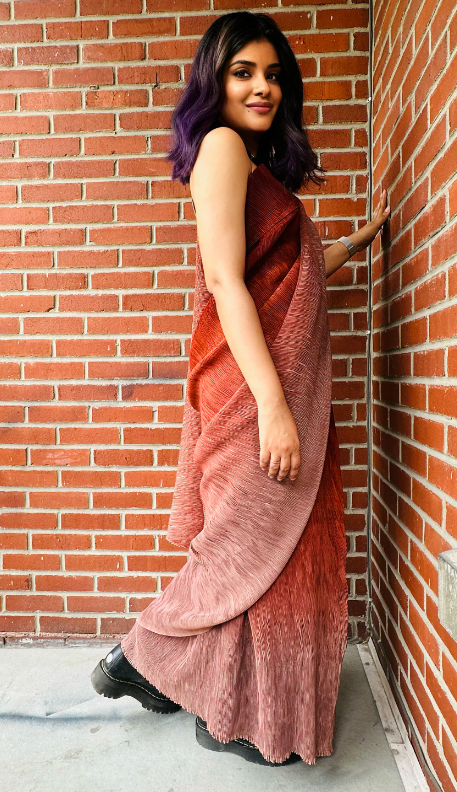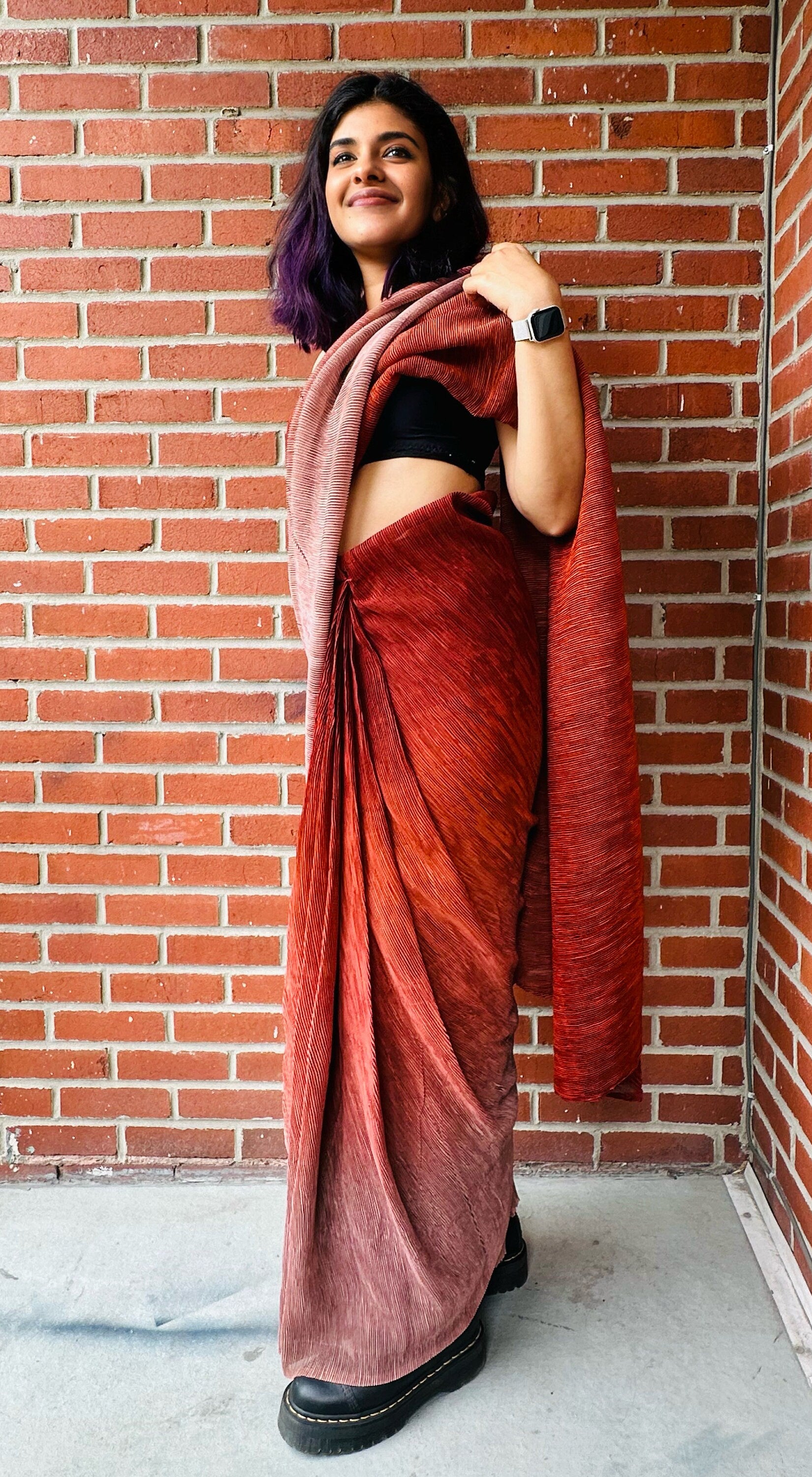 The functional Saree comes pre-pleated and pre-stitched and ready to wear. It is made of crushed georgette fabric. The saree has a pre-stitched petticoat inside. It doesn’t come with a blouse.